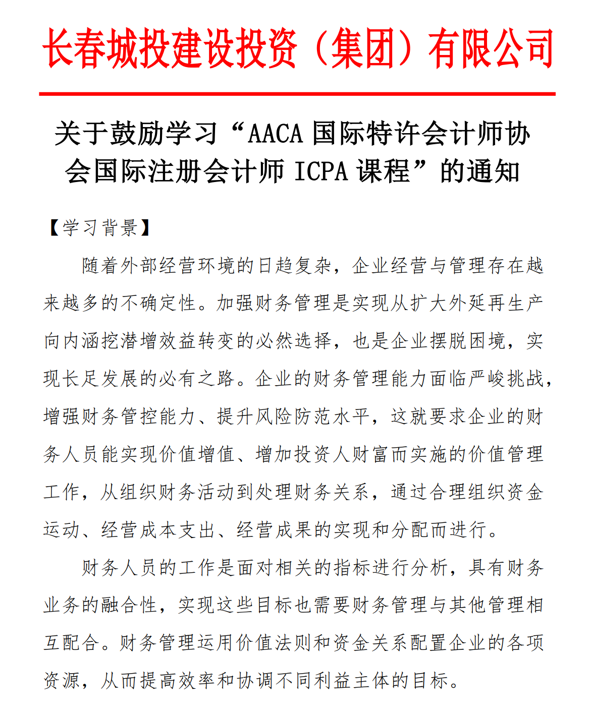 长春城投建设投资(集团)有限公司发文鼓励学习ICPA国际注册会计师