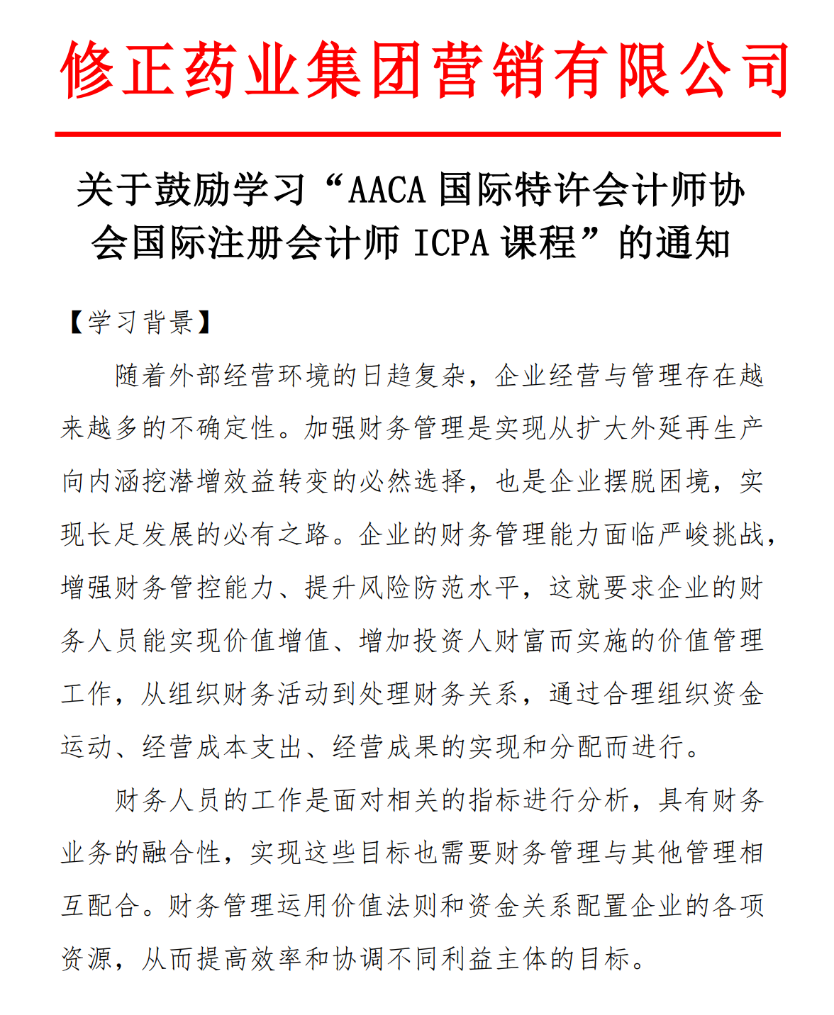 修正药业集团营销有限公司发文鼓励学习ICPA国际注册会计师