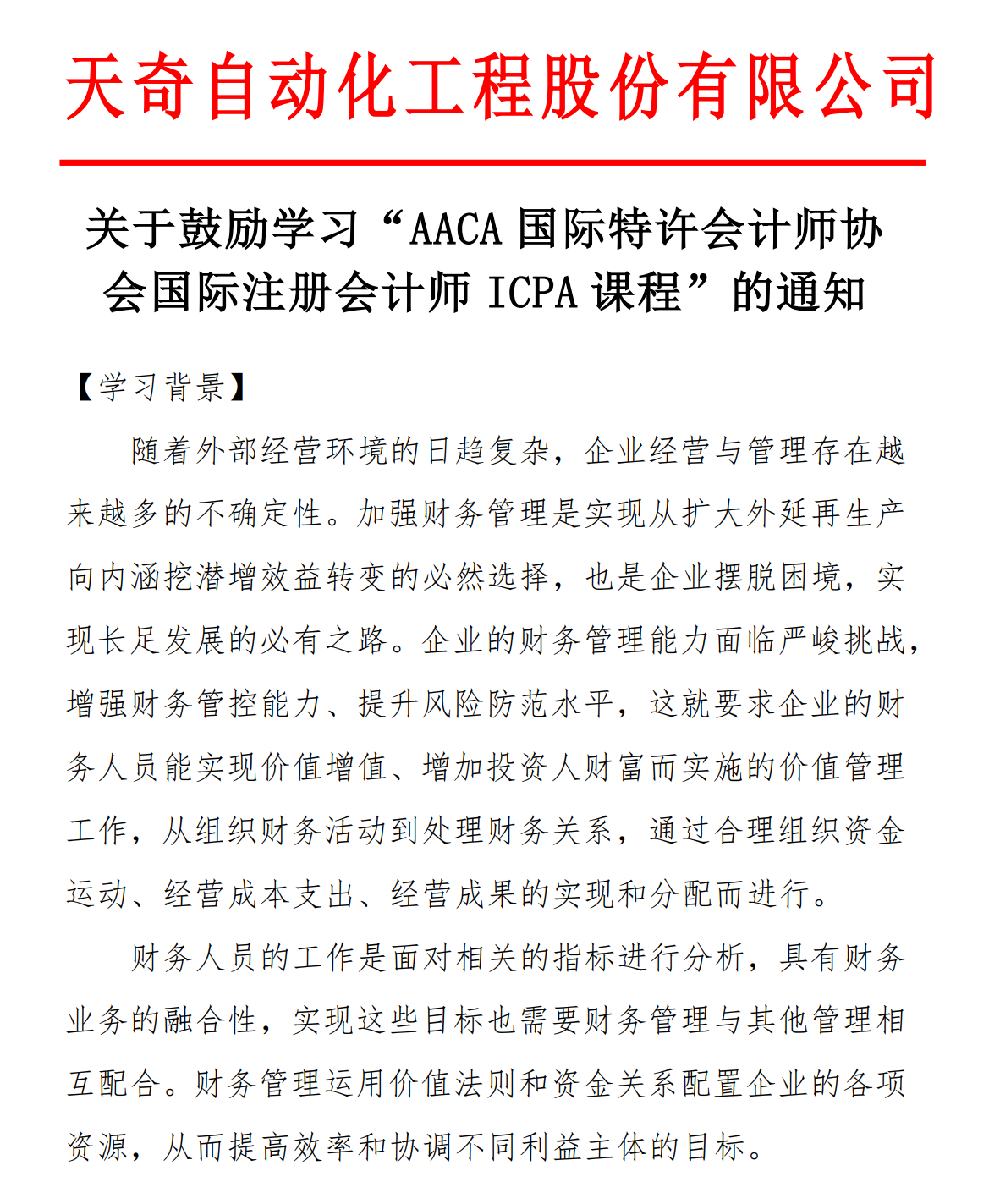 天奇自动化工程股份有限公司发文鼓励学习ICPA国际注册会计师