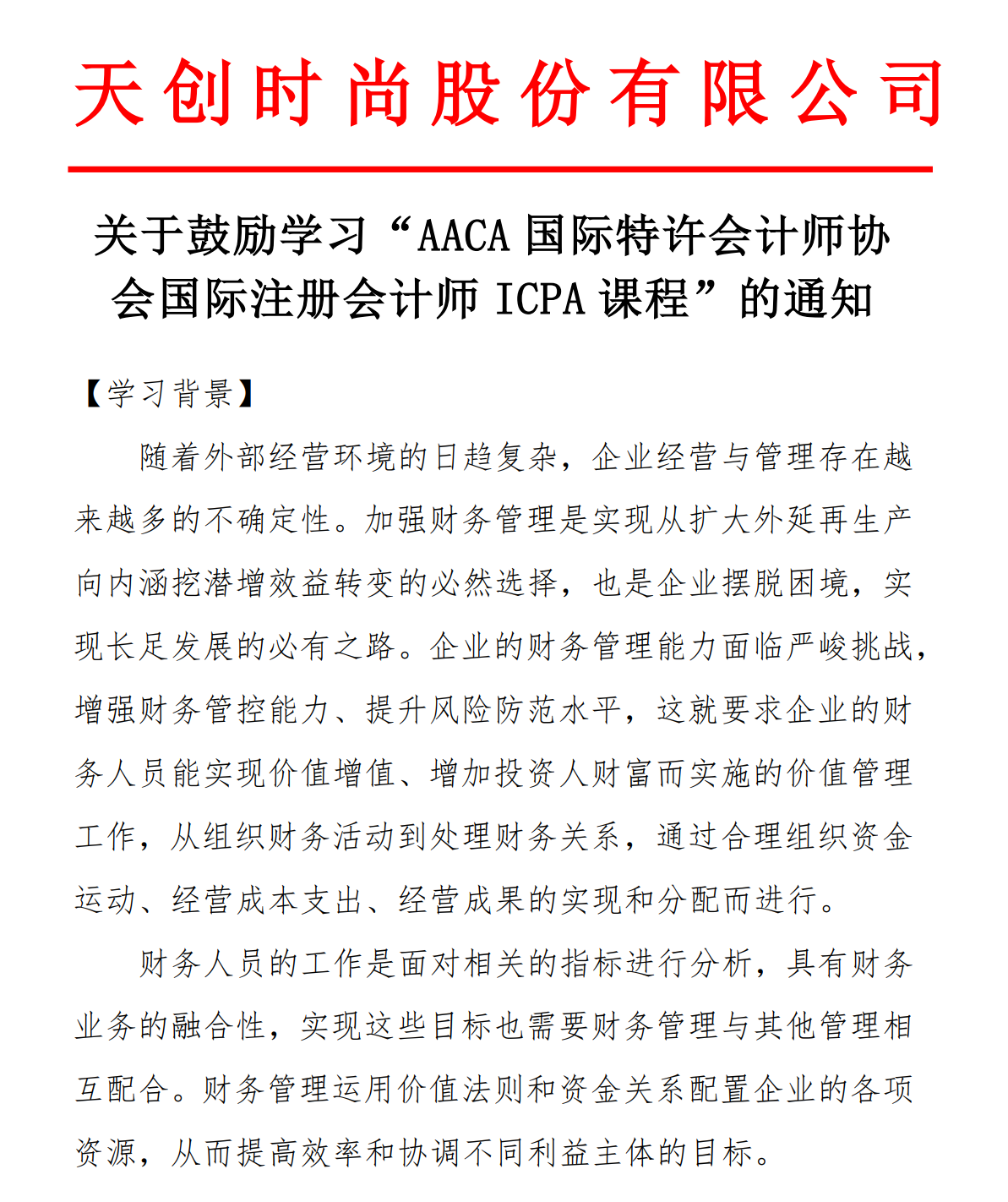 天创时尚股份有限公司发文鼓励学习ICPA国际注册会计师