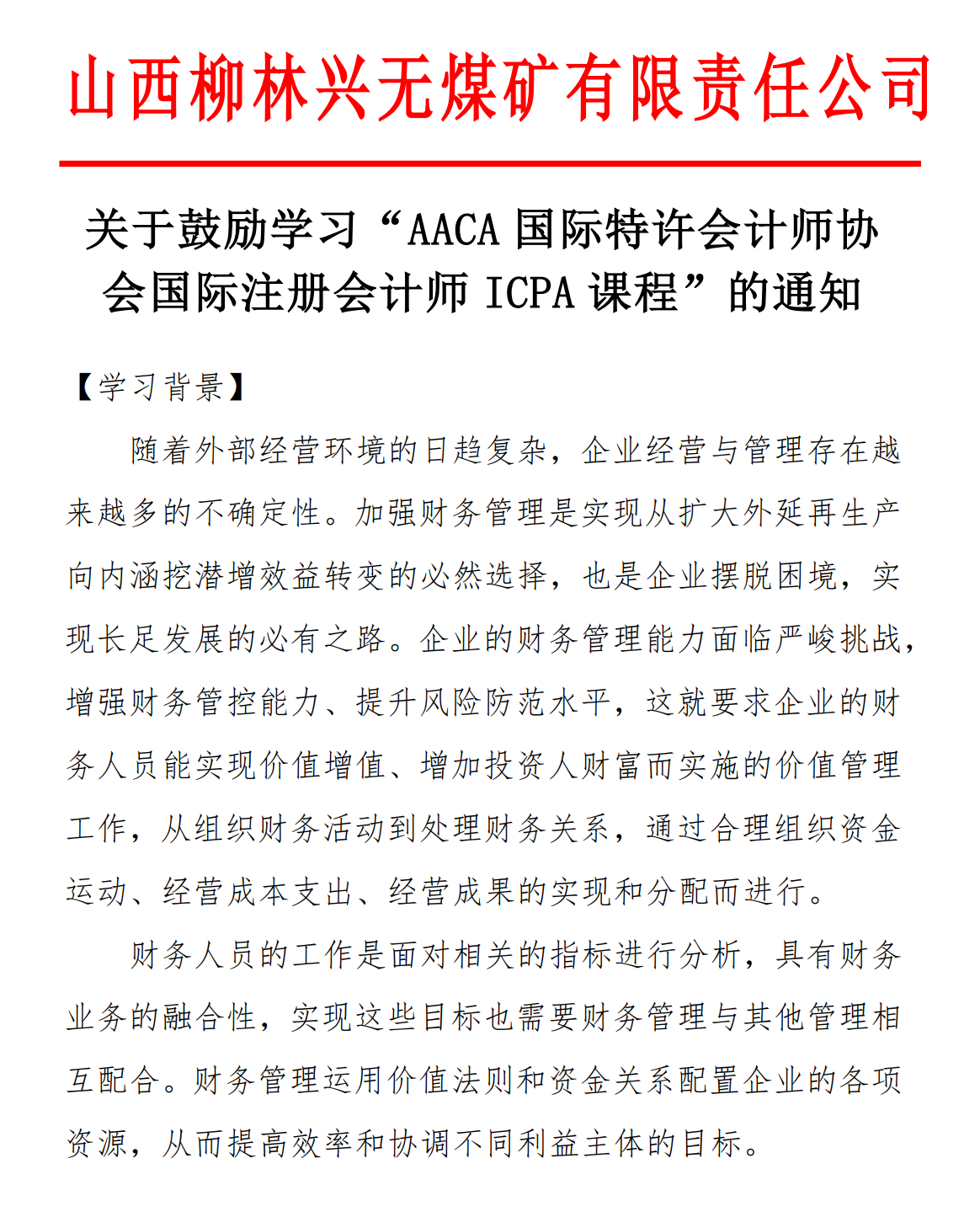 山西柳林兴无煤矿有限公司发文鼓励学习ICPA国际注册会计师