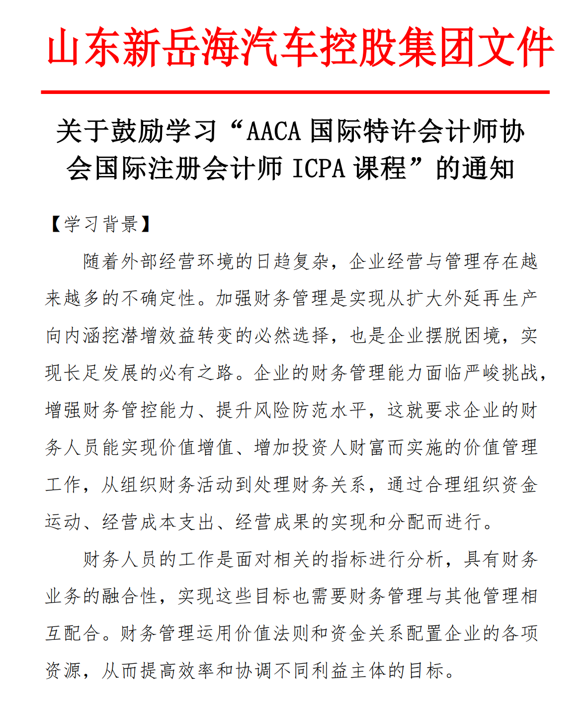 山东新岳海汽车控股集团有限公司发文鼓励学习ICPA国际注册会计师
