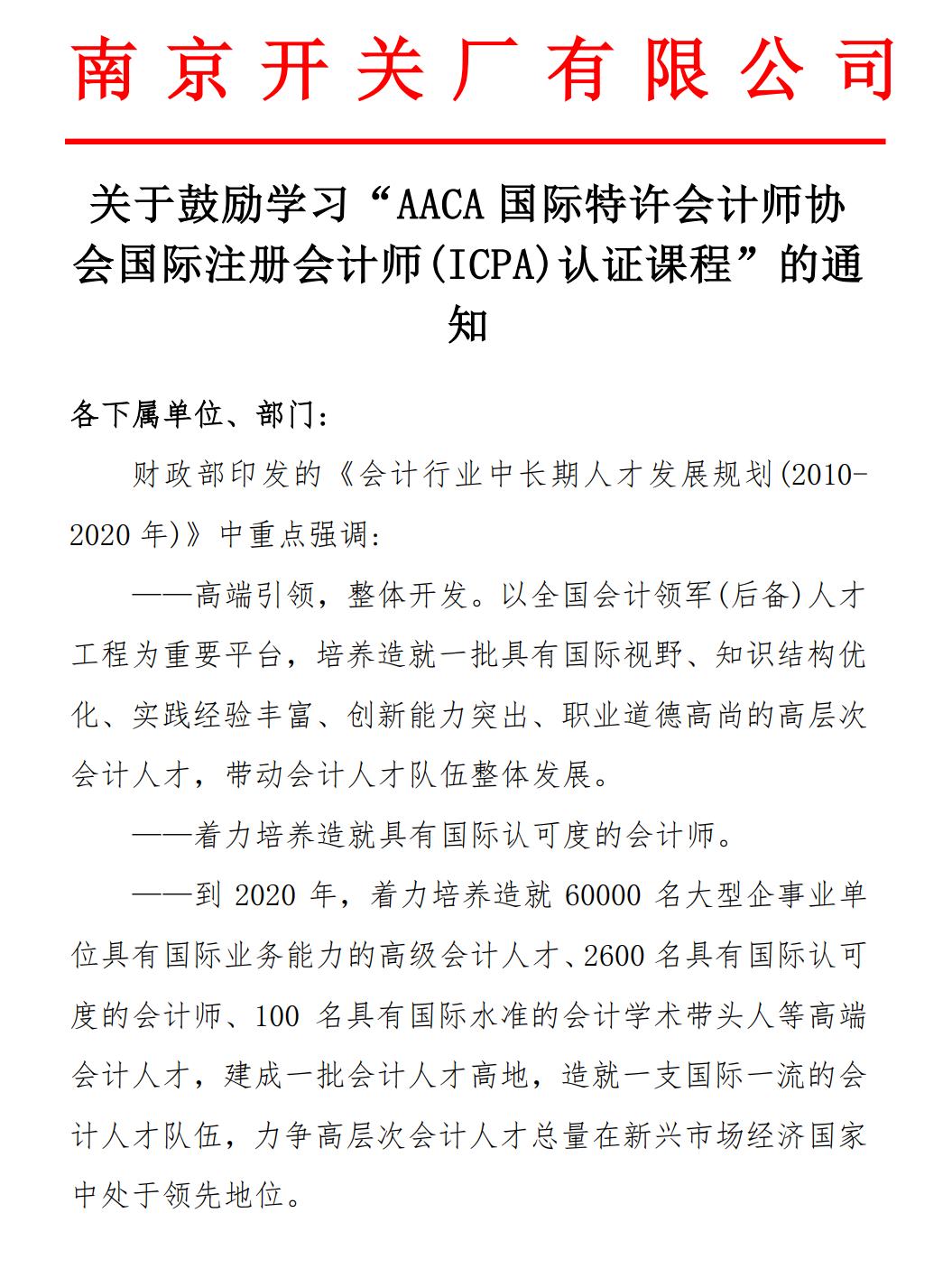 南京开关厂有限公司发文鼓励学习ICPA国际注册会计师