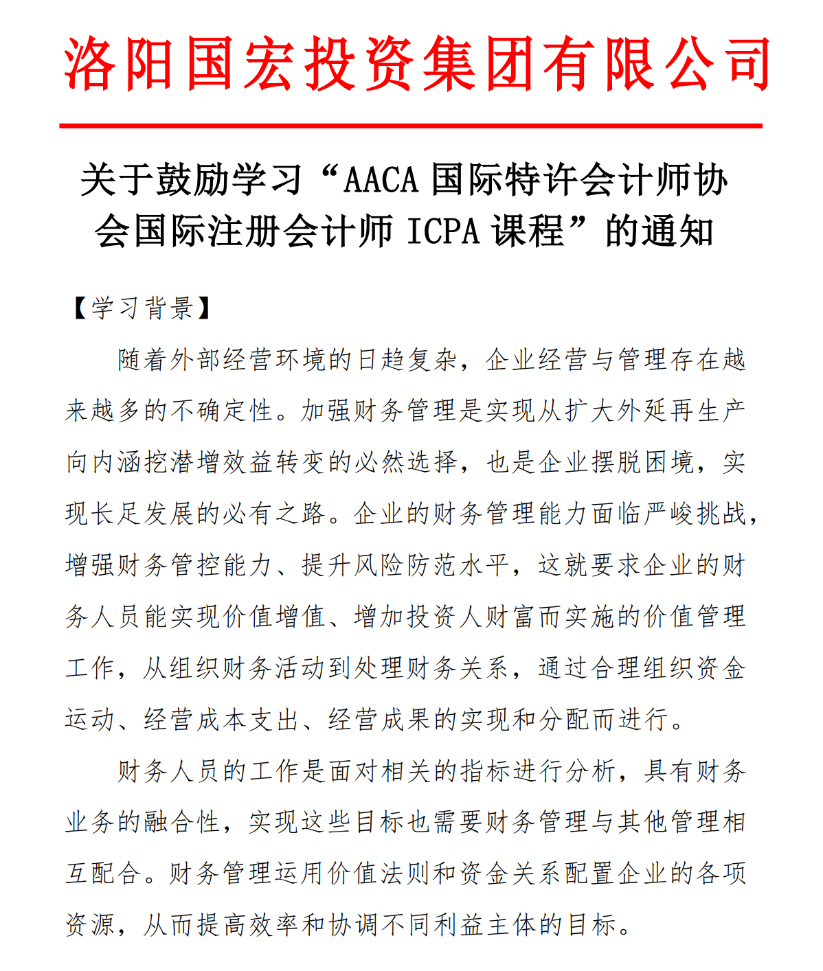 洛阳国宏投资集团有限公司发文鼓励学习ICPA国际注册会计师