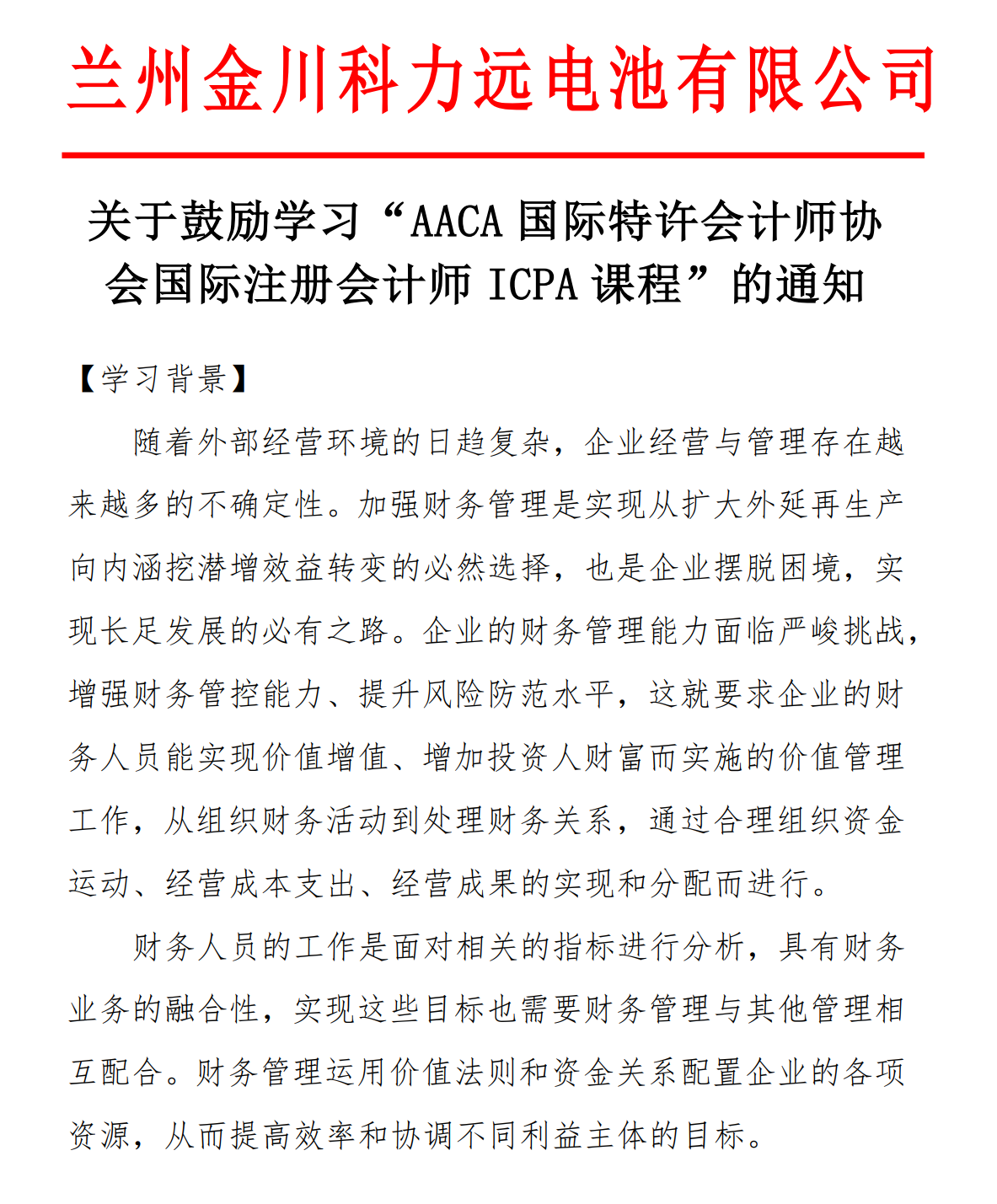 兰州金川科力远电池有限公司发文鼓励学习ICPA国际注册会计师