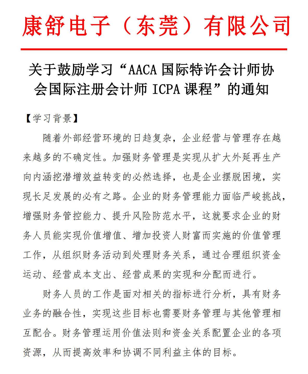 康舒电子(东莞)有限公司发文鼓励学习ICPA国际注册会计师