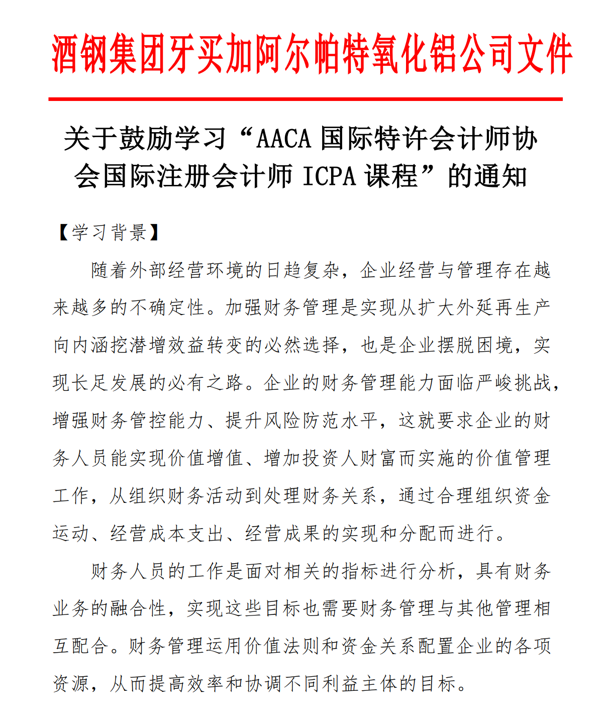酒钢集团牙买加阿尔帕特氧化铝公司发文鼓励学习ICPA国际注册会计师