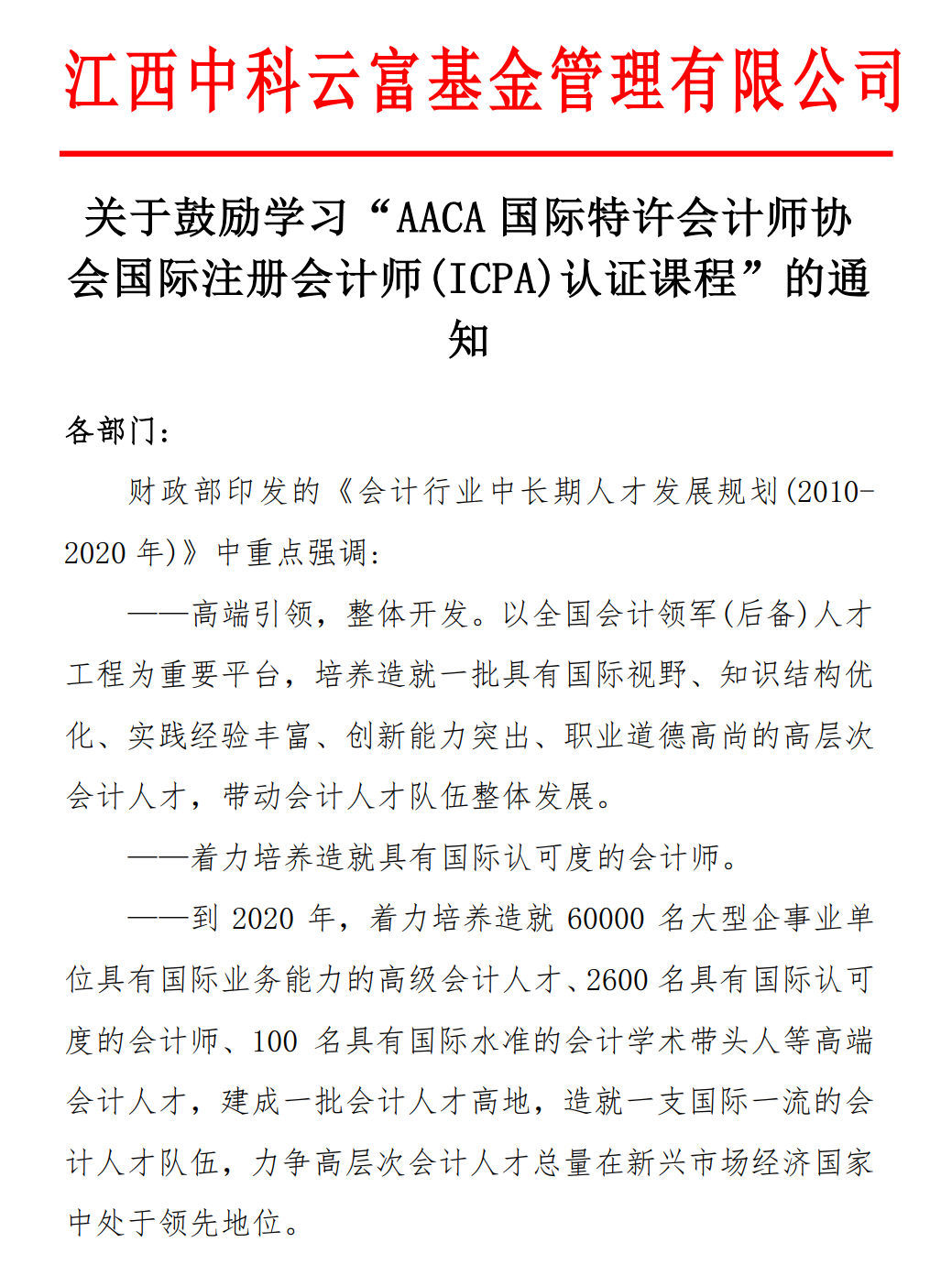 江西中科云富基金管理有限公司发文鼓励学习ICPA国际注册会计师