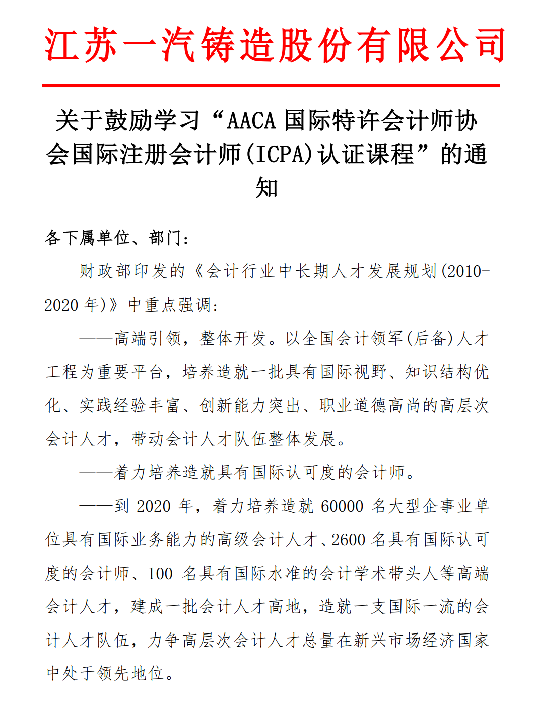 江苏一汽铸造股份有限公司发文鼓励学习ICPA国际注册会计师