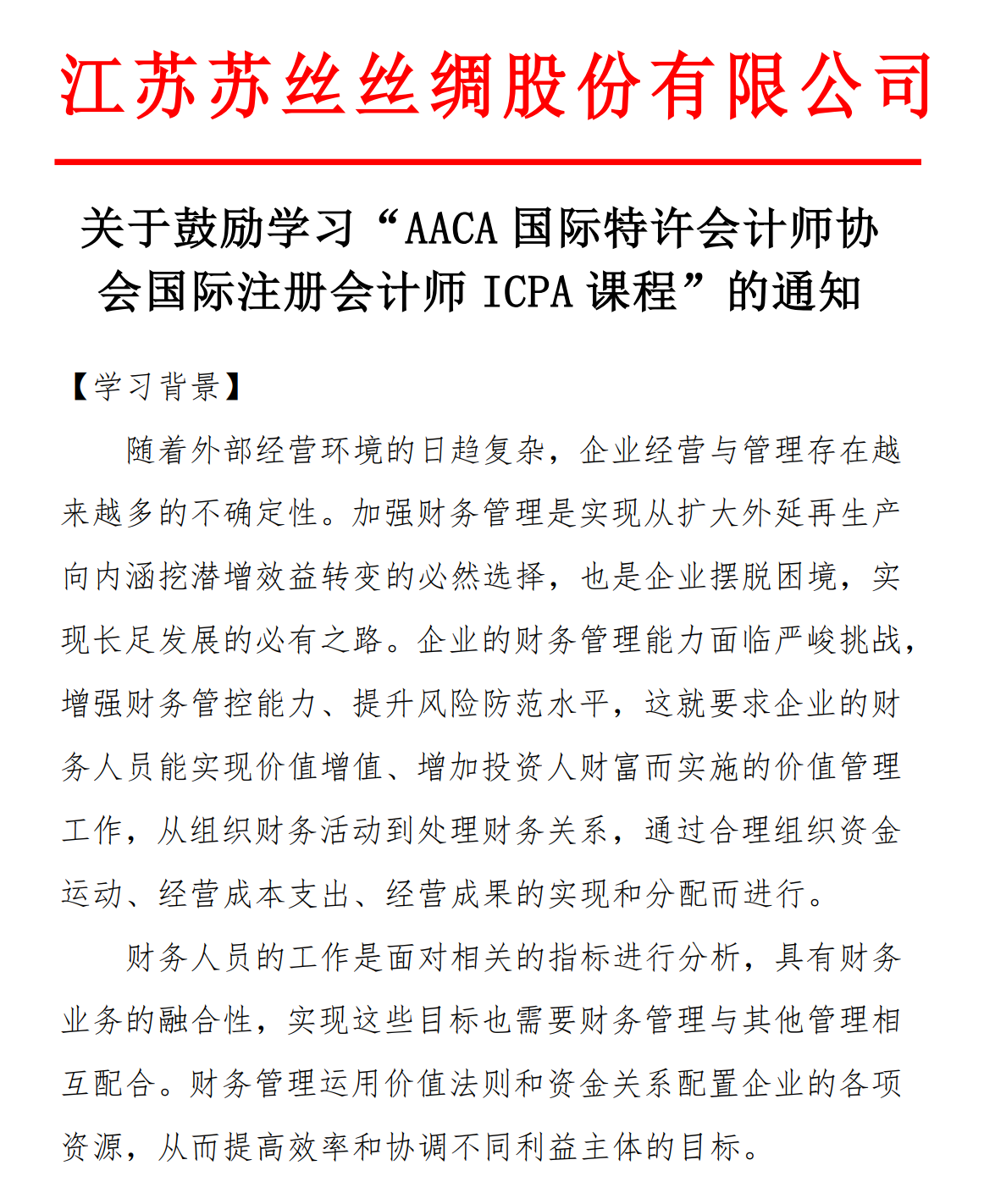 江苏苏丝丝绸股份有限公司发文鼓励学习ICPA国际注册会计师