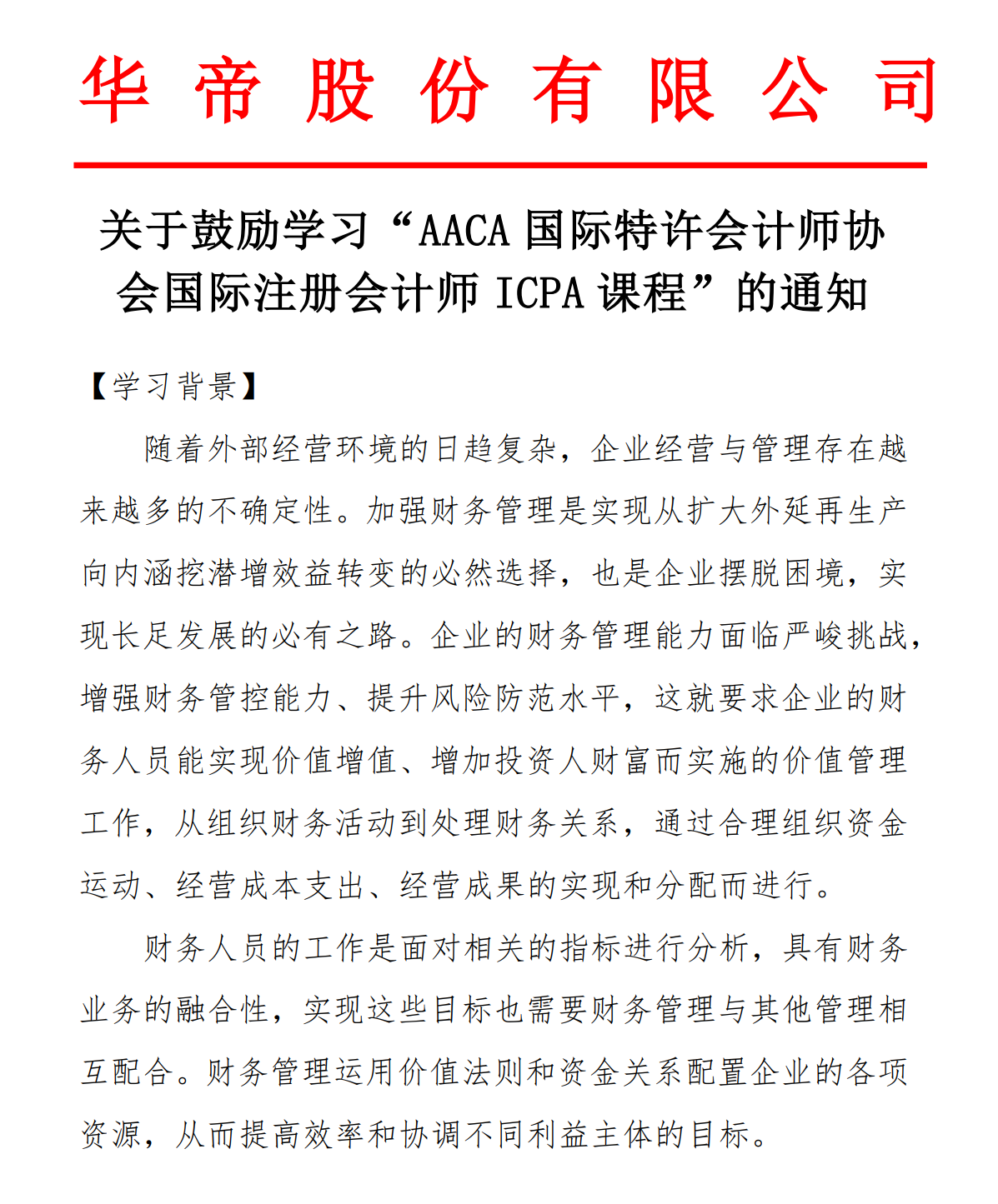 日前华帝股份有限公司发布关于鼓励学习“AACA国际特许会计师协会国际注册会计师(ICPA)认证课程”的通知,鼓励下属单位、部门进行学习。 面对跨国公司的人才发展战略,优秀企业华帝股份有限公司,重视培养和留住优...
