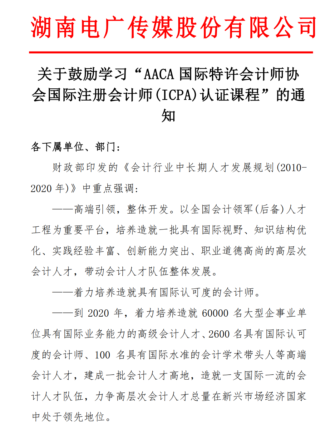 湖南电广传媒股份有限公司发文鼓励学习ICPA国际注册会计师