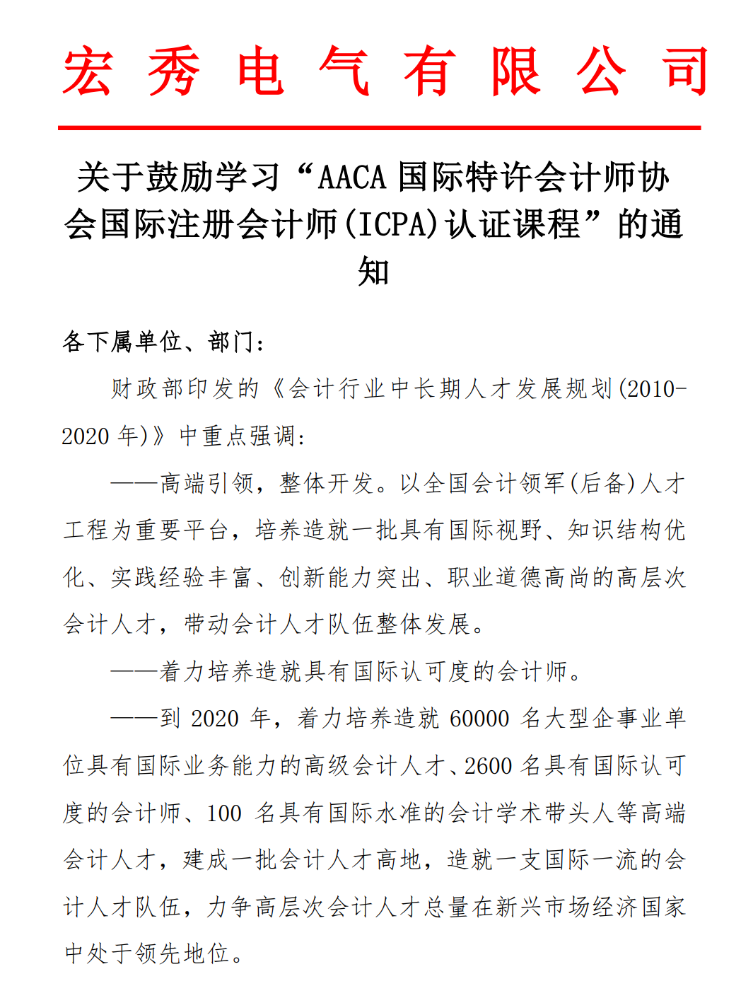 宏秀电气有限公司发文鼓励学习ICPA国际注册会计师