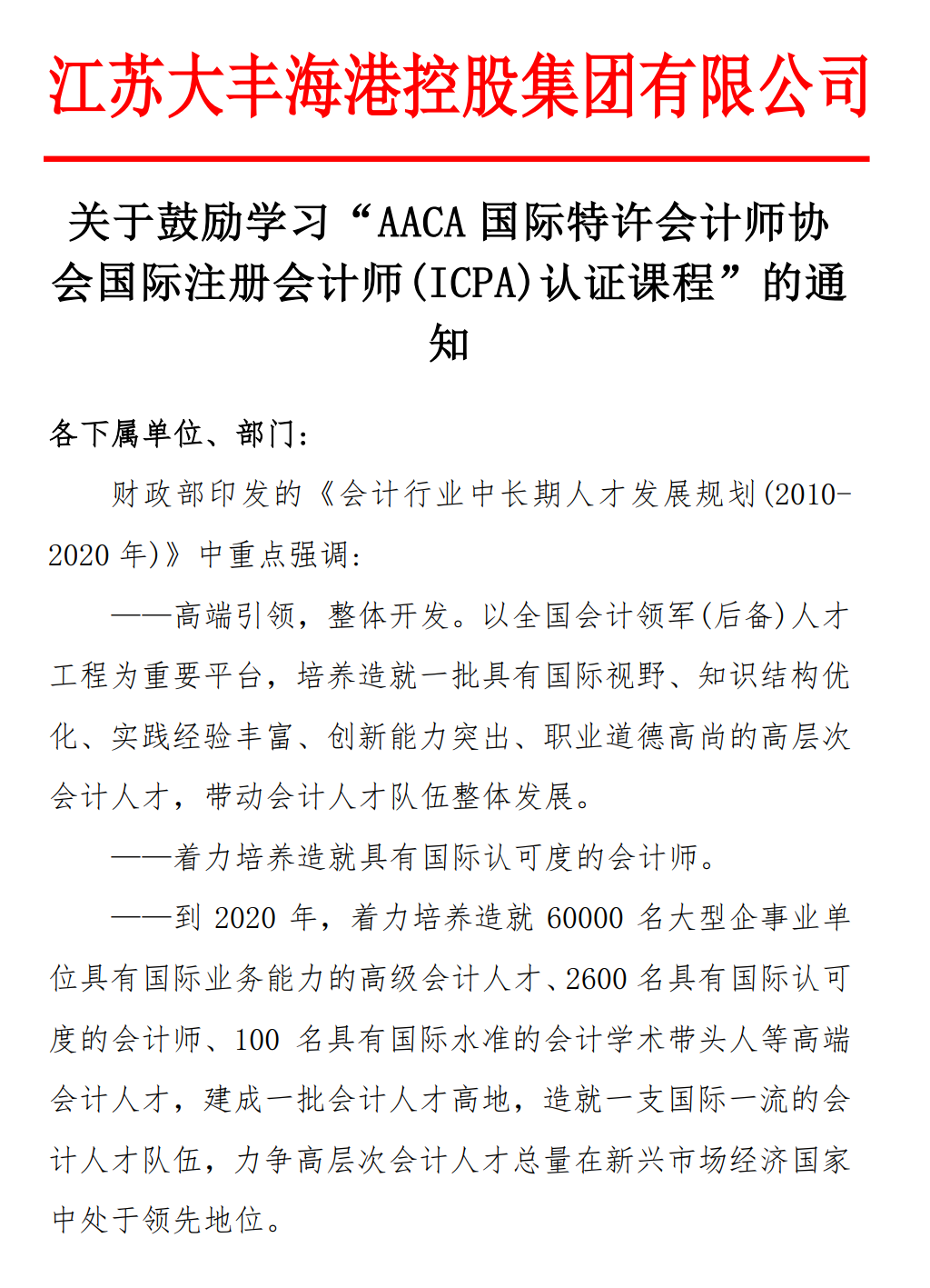 江苏大丰海港控股集团有限公司发文鼓励学习ICPA国际注册会计师