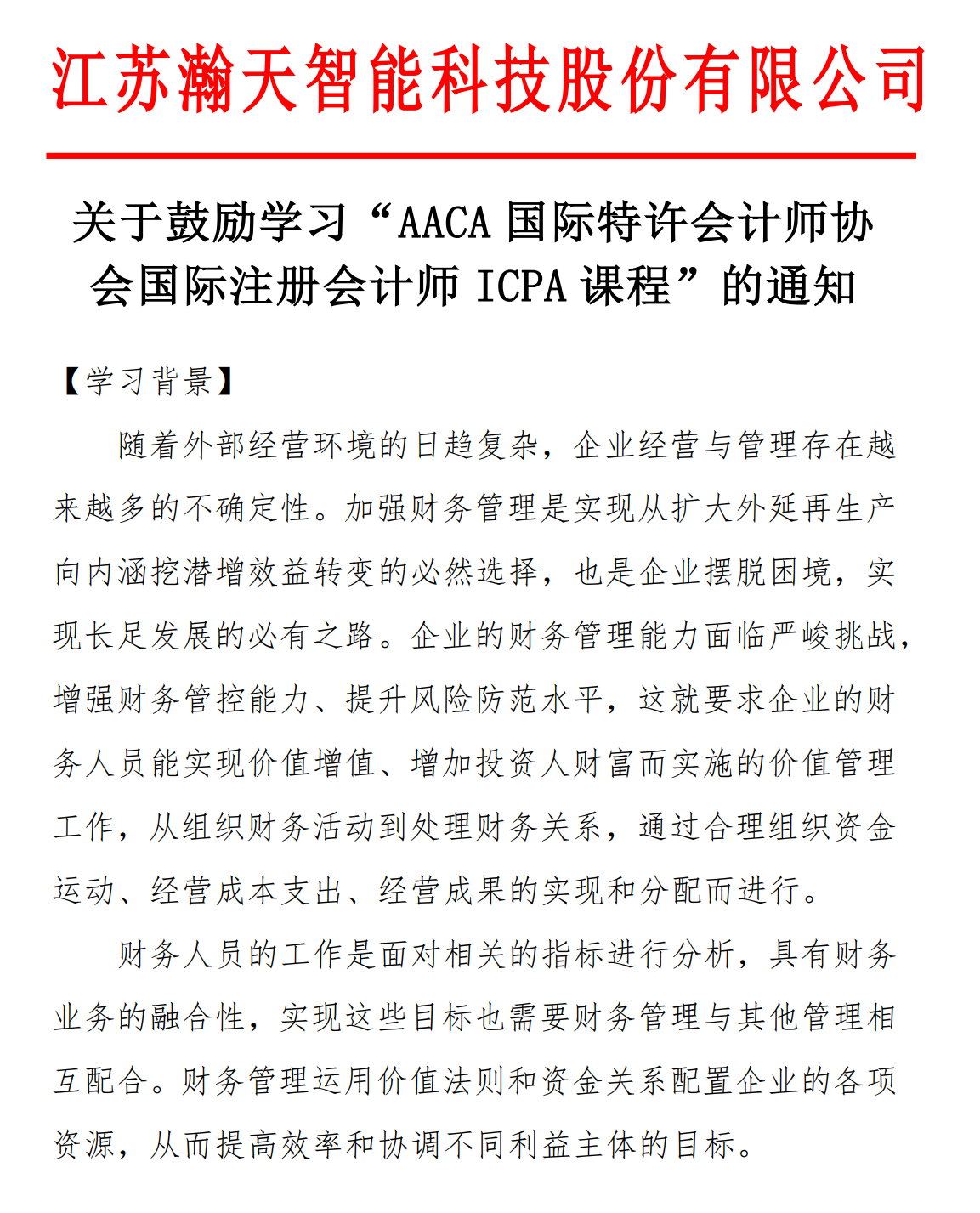 江苏瀚天智能科技股份有限公司发文鼓励学习ICPA国际注册会计师