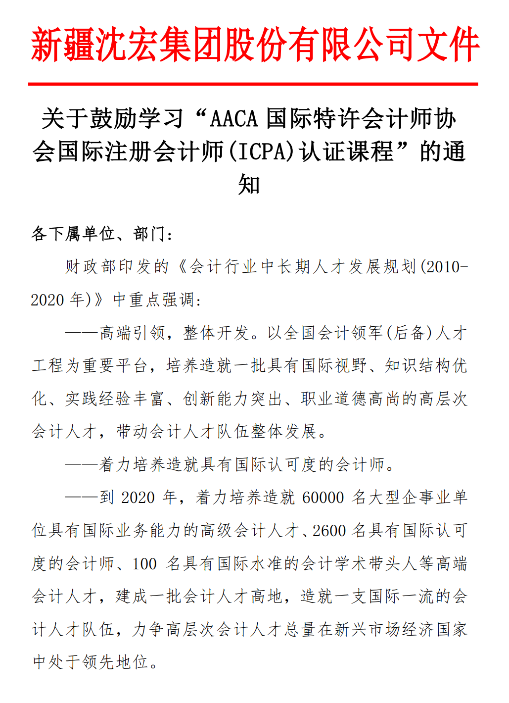 新疆沈宏集团股份有限公司发文鼓励学习ICPA国际注册会计师