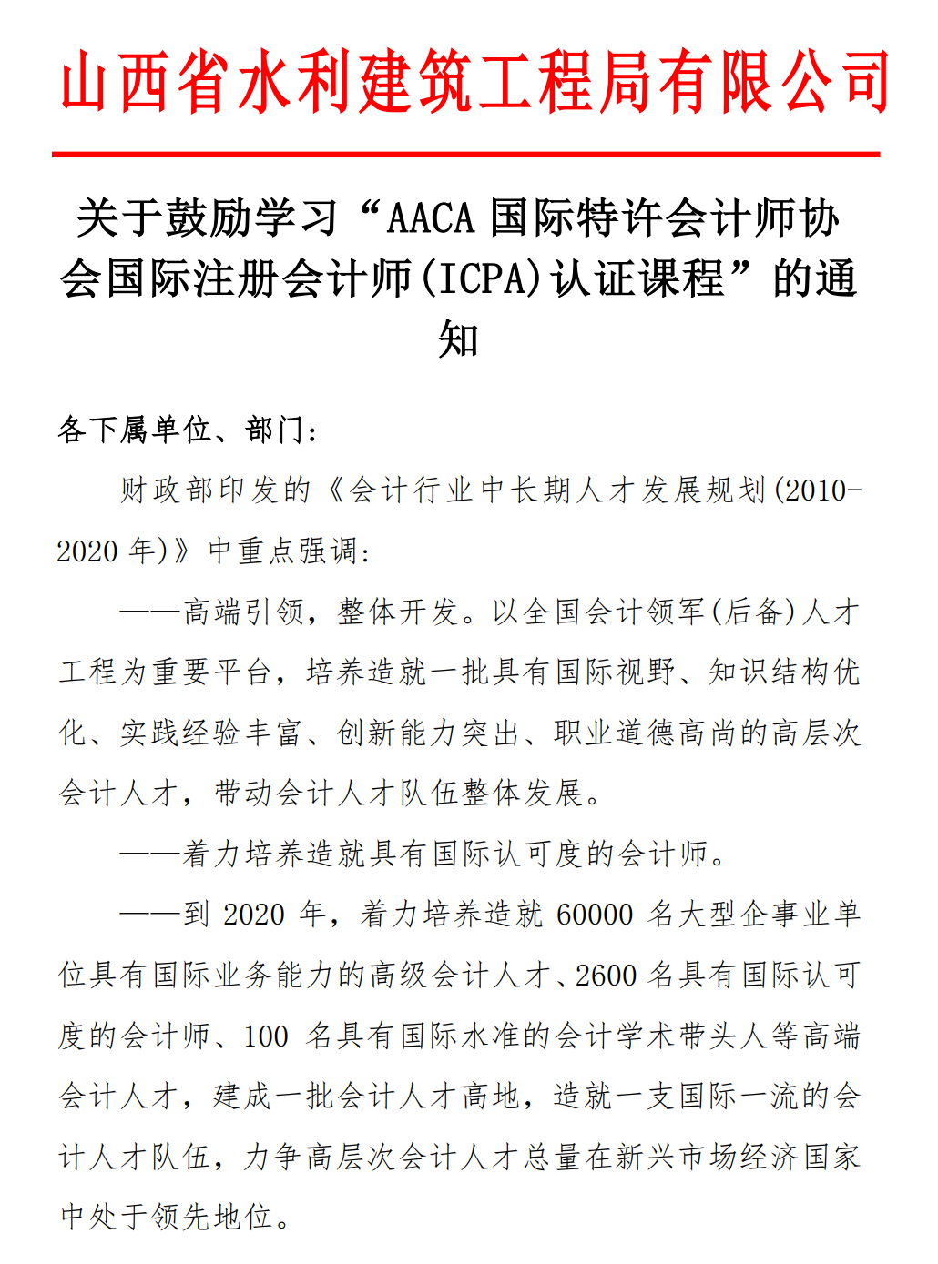 山西省水利建筑工程局有限公司发文鼓励学习ICPA国际注册会计师