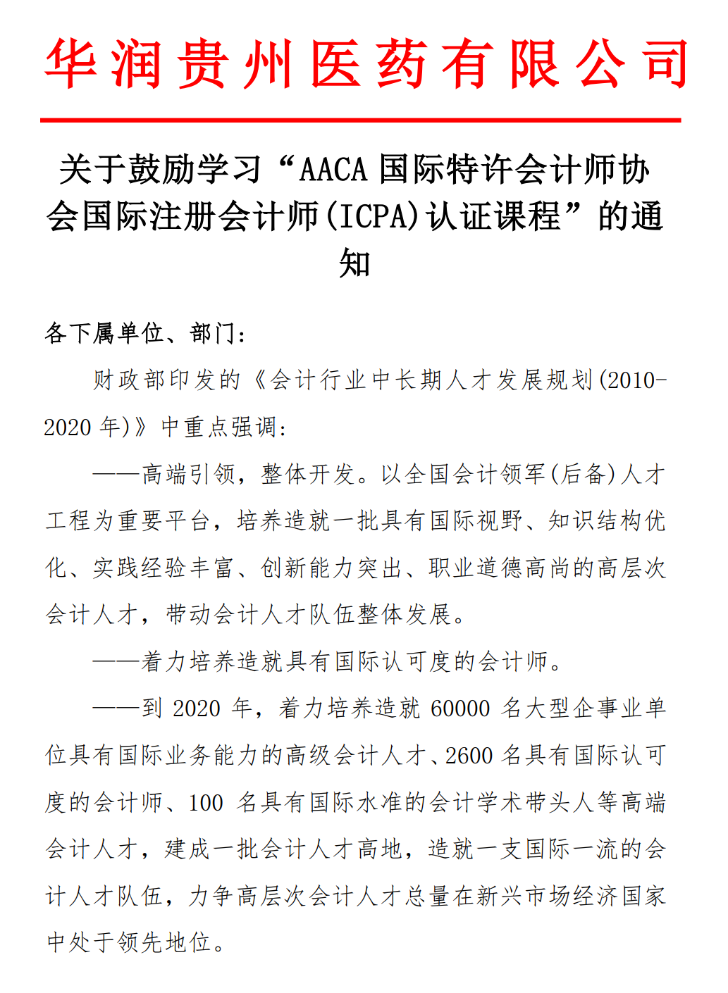 华润贵州制药有限公司发文鼓励学习ICPA国际注册会计师