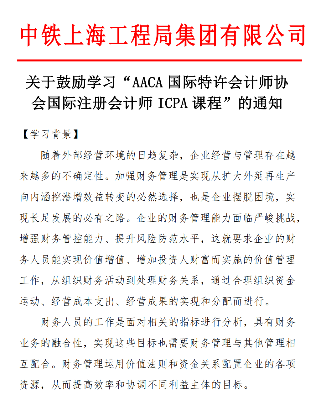 中铁上海工程局集团有限公司发文鼓励学习ICPA国际注册会计师