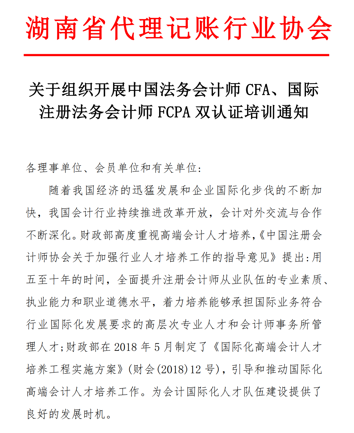湖南省代理记账协会关于组织开展国际注册会计师ICPA、国际注册法务会计师FCPA认证培训的通知