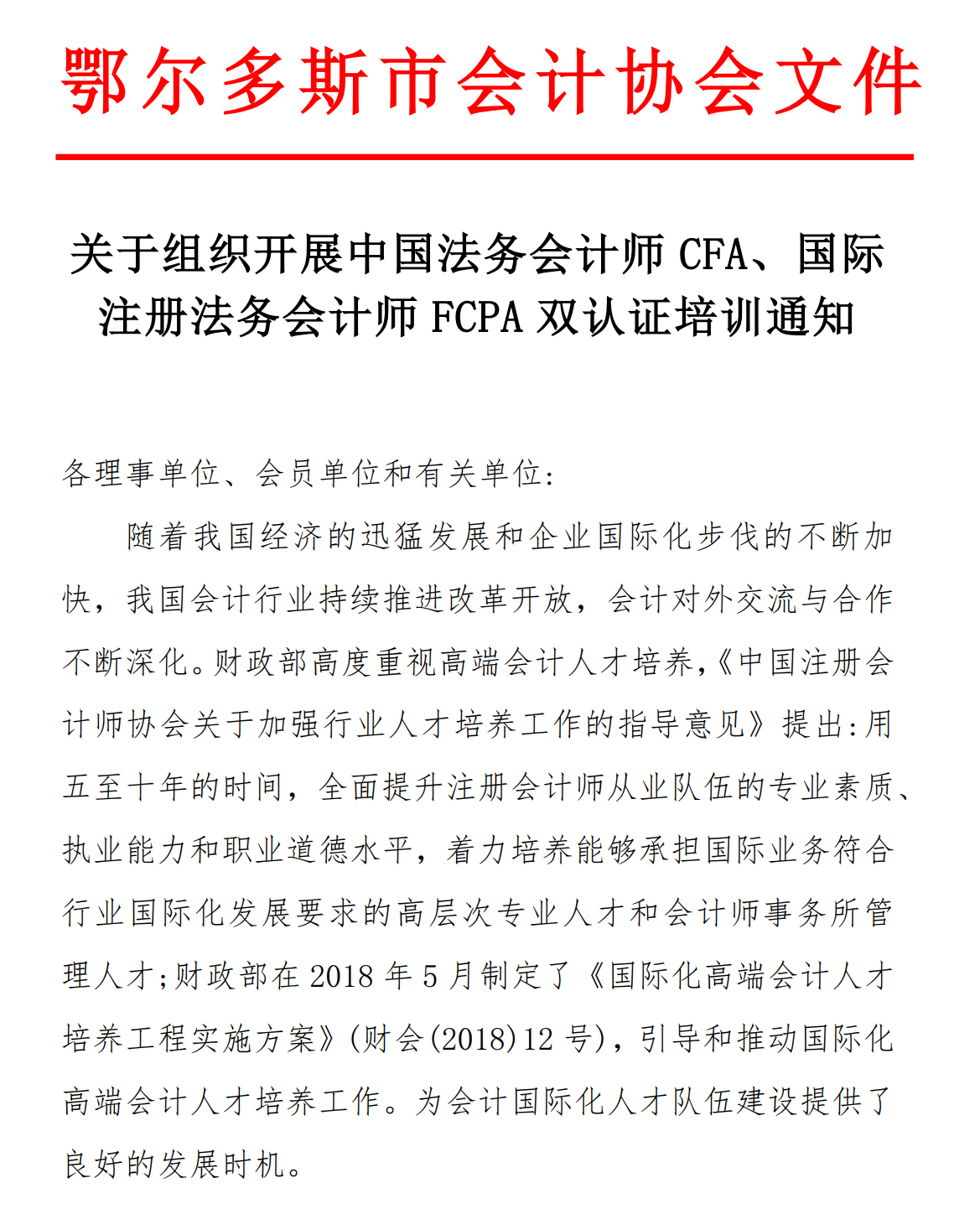 鄂尔多斯会计协会关于组织开展国际注册会计师ICPA、国际注册法务会计师FCPA认证培训的通知