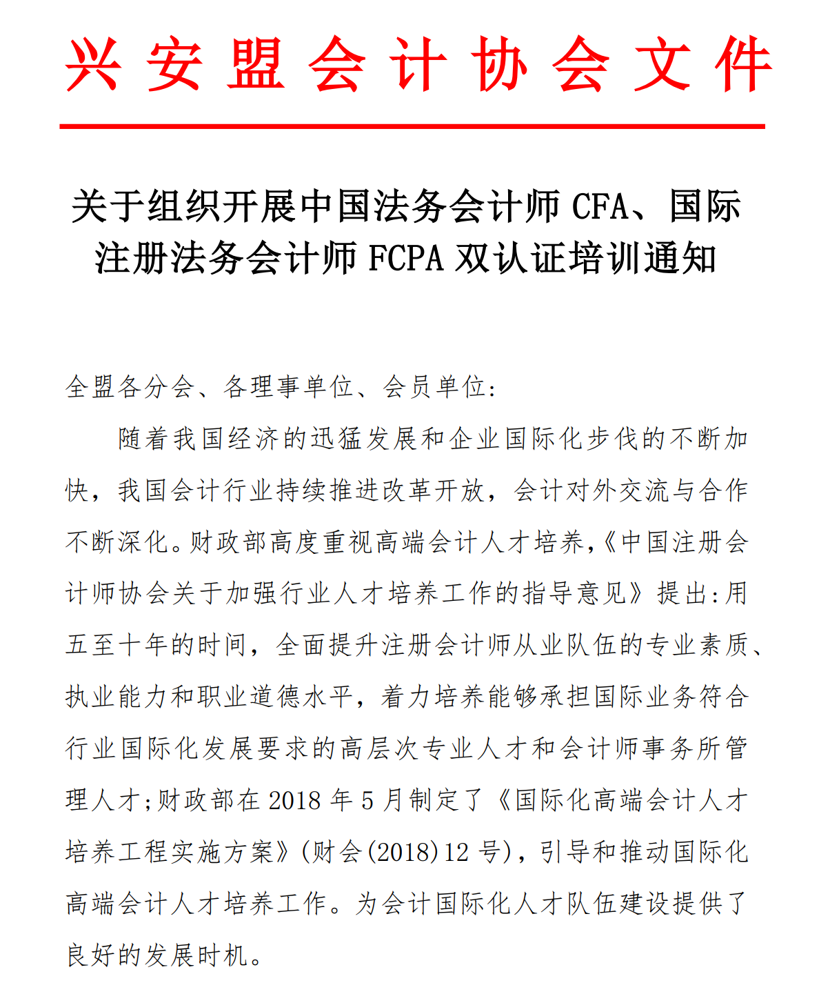 兴安盟会计协会关于组织开展国际注册会计师ICPA、国际注册法务会计师FCPA认证培训的通知
